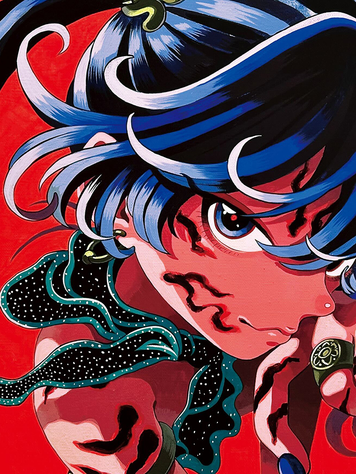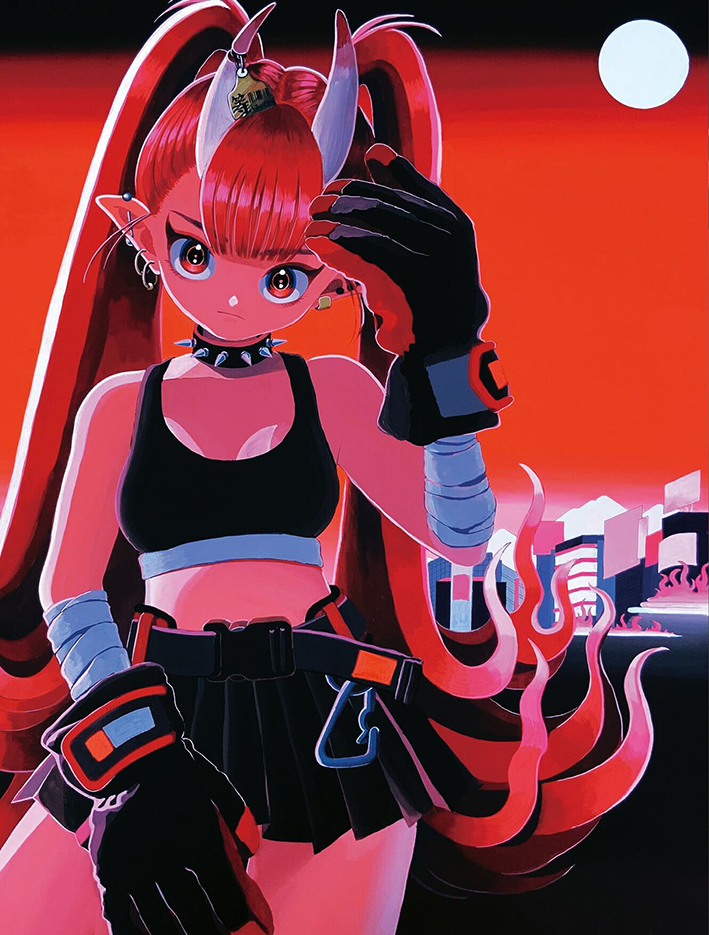 生き様を見せつけるかのような強い目線と、蛍光色を用いた鮮烈な色使いが特徴。