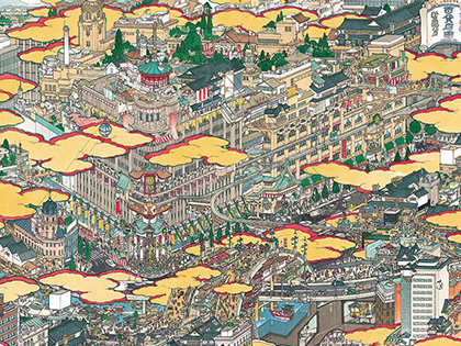 山口晃氏は合戦図、時空の混在、更には画面を埋め尽くすように描き込まれた街の鳥瞰図等のモチーフを使い、観客を飽きさせないユーモアとシニカルさを織り交ぜた作風に代表されるアーティストです。