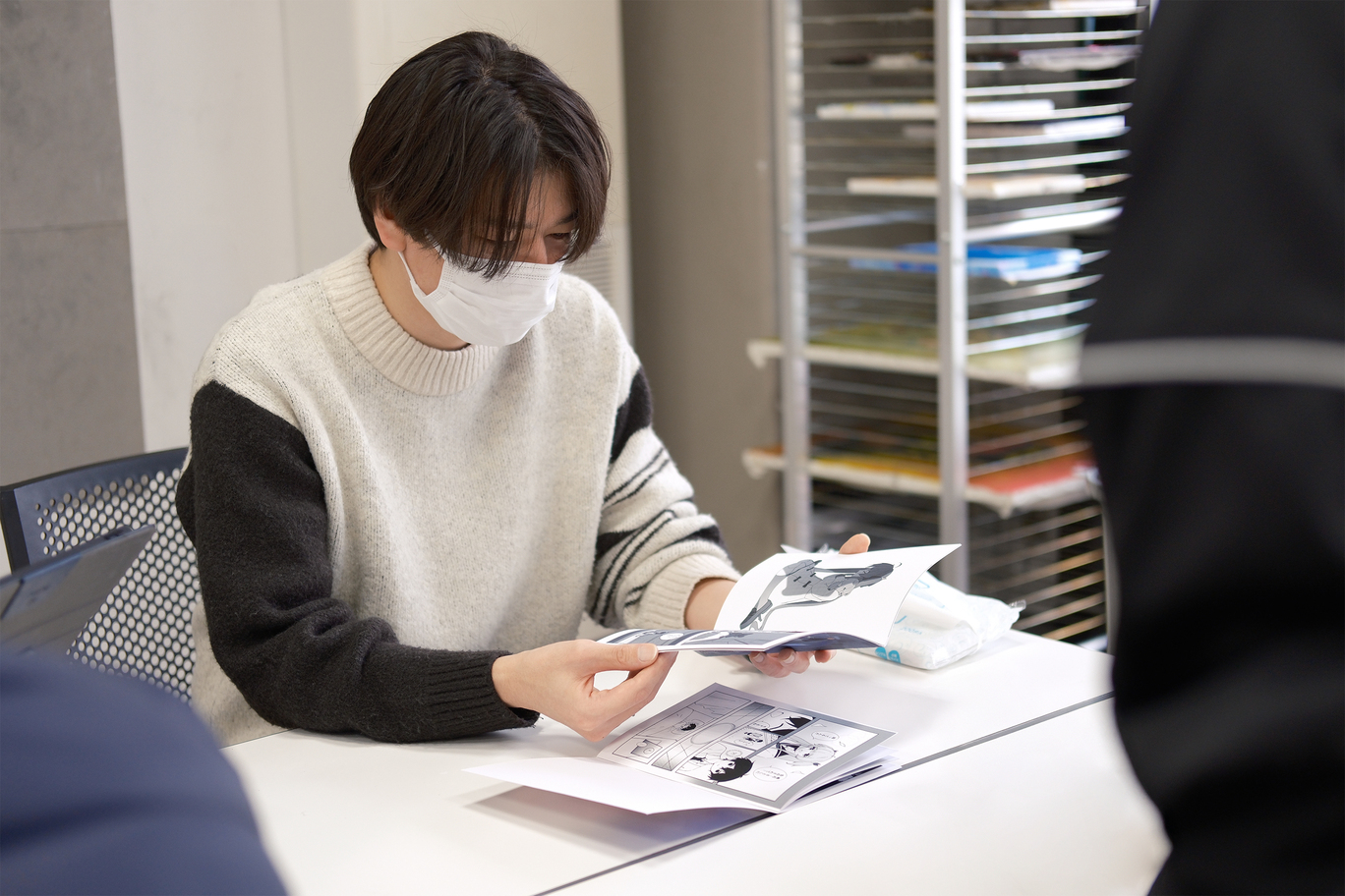 丸山先生の担当編集者であるサイコミ編集部・副編集長の宮崎成俊氏にもご来校いただき、丸山先生とともに学生一人ひとりの漫画作品を対面形式で直接講評していただきました。