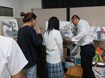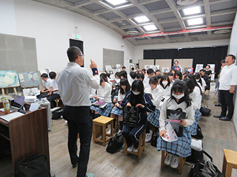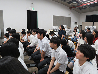 授業では、専門的な実技、知識を中心として幅広く美術を学んでいきます。今回は、多摩美術大学の協力のもと、美大の専攻紹介、選択方法などをスライドを交えてわかりやすく解説して頂きました。