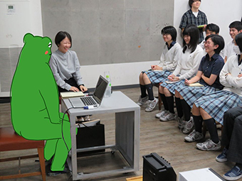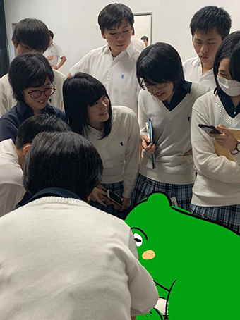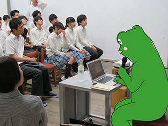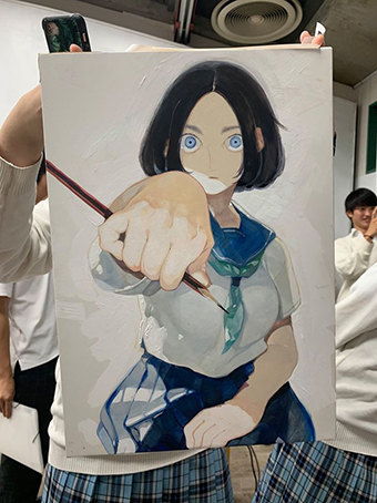 11月に発売された「ブルーピリオド6巻」表紙の生原稿を講演会当日に持って来ていただいていましたが、講演会実施日が6巻の発売前だったこともあり、公開できなかった写真がありました。また、山口つばさ先生は顔出しが出来ないため、写真に直筆イラストを入れて頂き、公開させて頂くことになりました。カエルイラストが山口先生の直筆です。かわいいですね。