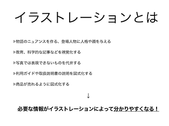 初回の授業では、「イラストレーションとは」「イラストレーションの起源」「印刷技法の発展と普及」「日本のイラストレーション史」です。