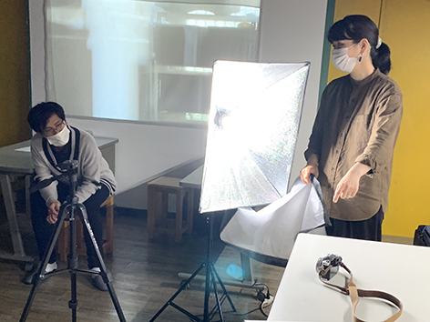 特別授業ではカメラ、三脚などの撮影機材の説明から始まり、簡単なレフ板の作り方、撮影方法、カメラの設定など実際にプロとして写真撮影をするための基礎知識を学びました。