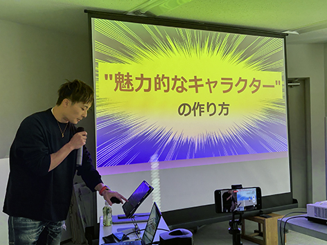 サイコミにて2019年から連載している「TSUYOSHI 誰にも勝てない、アイツには」を連載している丸山先生に漫画を描く気持ちや続ける大切さ、壁を乗り越える大切さとかコツをお話ししてくれます。現在、同漫画は13巻まで続く人気漫画。美大生出身の丸山先生が「魅力あるキャラクターの作り方」講習を実施してくれました。専門生、高校生合同で人気漫画家が描くキャラクターの秘密について解説してくれました。
