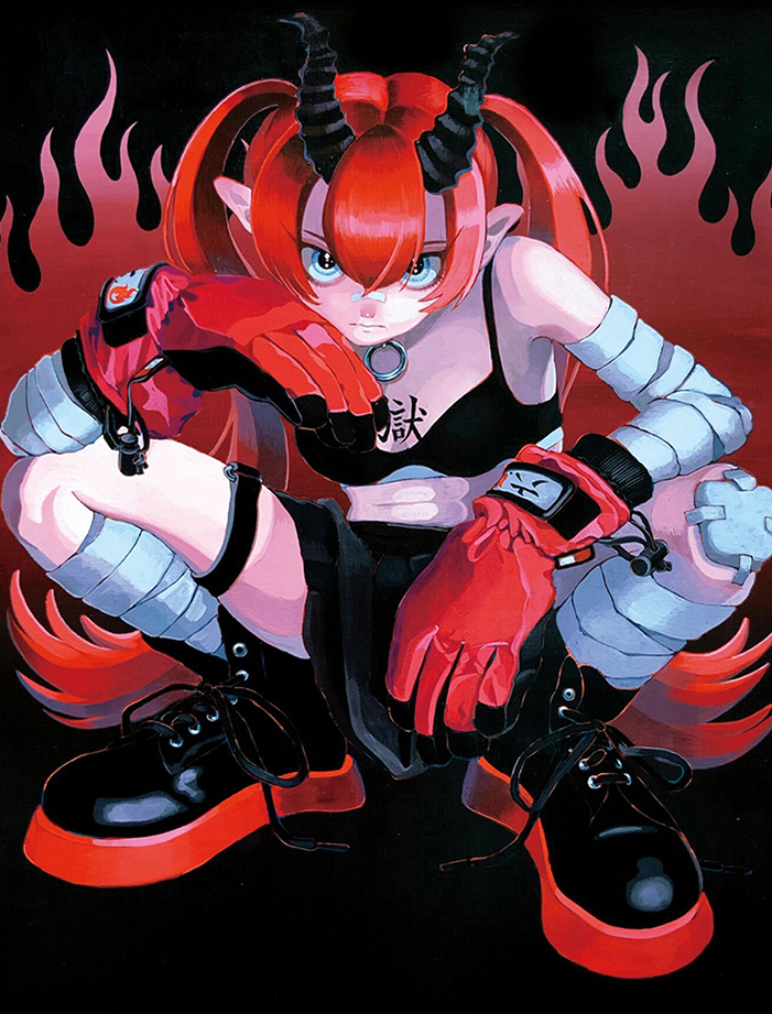 生き様を見せつけるかのような強い目線と、蛍光色を用いた鮮烈な色使いが特徴。