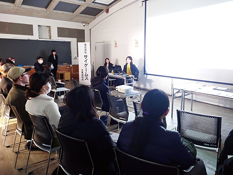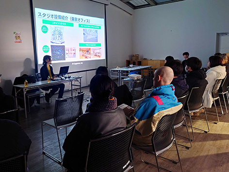 今回は株式会社Cygamesの人事担当者に来ていただき、会社説明を行なっていただきました。イラストレーションコース、グラフィックデザインコースの学生たちを中心に説明を受け、またポートフォリオを持参していただき閲覧させていただきました。