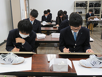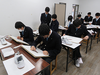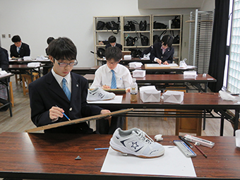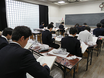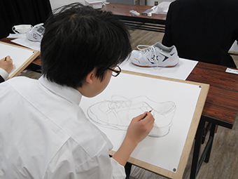 対象を細部まで観察して表現をすることは、思ったよりも難しいことです。人間の視覚は、様々な主観的な要素によって冷静に見ることができません。そのため、デッサンは如何に客観視して描けるかがポイントになります。今回の課題は靴ですが、紐の網目、靴の表面の質の違いなど情報は山のようにあります。1年生の真剣に取り組む姿が新鮮です。 これからの成長が楽しみですね。