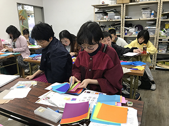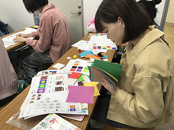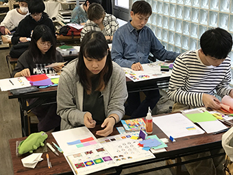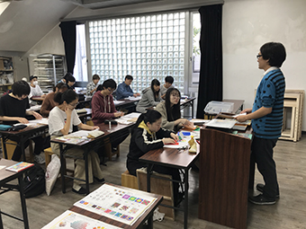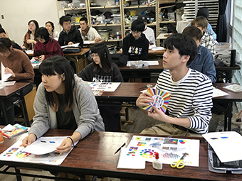 武蔵野学芸専門学校専門課程では、実体験のみに頼るのではなく、理論的に美術を学ぶ授業も展開しています。今回は滝口先生による、色彩学の講義です。色彩学を通して美術の教養を深め、自己の表現を広げる工夫をしていきます。 五感を鍛えて感覚的に覚えていくことも大切ですが、理論が加わることで新たな表現が見えてくることもあります。授業では、色相、彩度、明度を始めとしたPCCSやマンセルシステムを理解しながら、色が起こす反応について講義しました。
