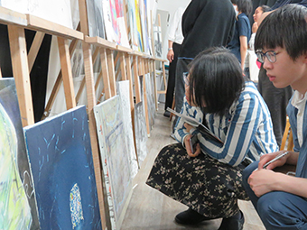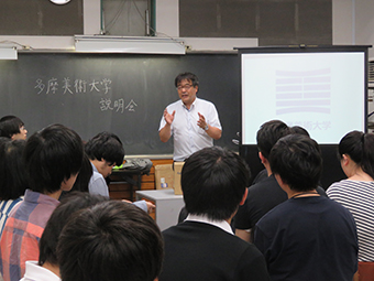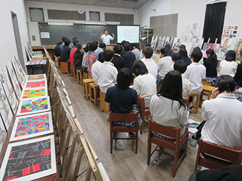 6月13日に多摩美術大学入試センター入試広報課長に来校して頂き、美大進学説明会を開催して頂きました。 専攻紹介、美大の選択方法などをスライドを交えてわかりやすく解説して頂きました。また、美術に向ける熱意や情熱の大切さなど大変熱いハートを持って、講演して頂きました。 作品展示も100点以上の作品が並び、学生たちも興味深々でした。 アニメーションの上映もあり、学生たちは美術の幅広い広がりを感じた時間だったと思います。