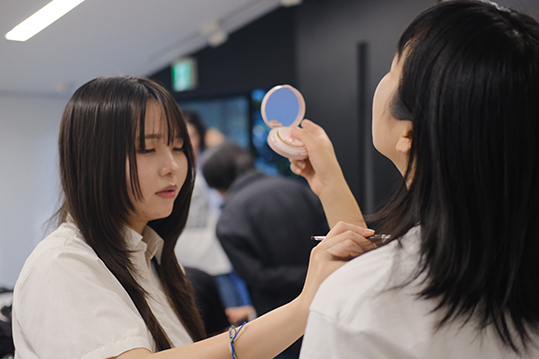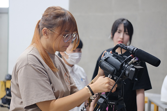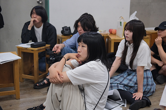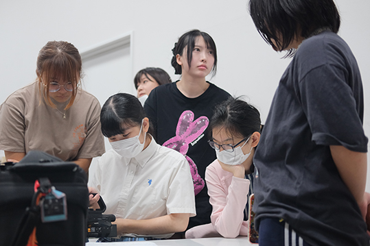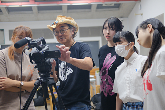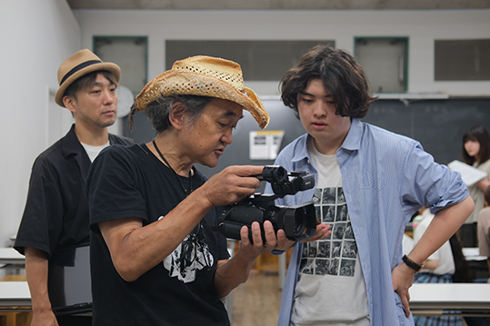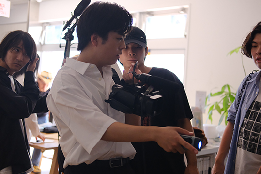 今回のワークショップは本校の専門生と高等課程生の有志が参加者を希望するイベントです。そのため年齢、課程を超えてグループになり、みんなで話し合いながら「自主映画」を作ります。台本の骨組みは上條監督に用意していただき、そこから配役や台本、コマ割り、撮影、編集を行いました。
