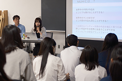 今回は株式会社komodoの社長のリッキー氏にご来校いただき会社説明、「NIUHI」の説明をしていただきました。今後の企画としては学生漫画家特集サイトを設置していただき、本校の学生やクラーク記念国際高等学校秋葉原キャンパスの漫画コースの学生が掲載されていくプロジェクトです。高校生漫画家、専門生漫画家に挑戦するビックプロジェクトです。