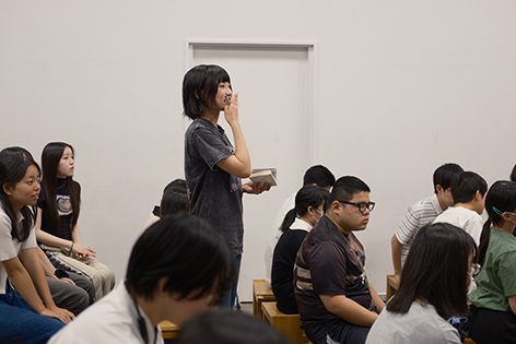 今回の授業では、デザインという分野の領域の広さを高等課程の生徒に知ってもらうというコンセプトです。鈴木先生のこれまでのアートプロジェクトを紹介していただき、日本デザインセンターとのコラボ作品ではデザイナーの原研哉先生と作り上げた水滴を使った作品など、普段触れることがない作品に高等課程生は釘付けでした。