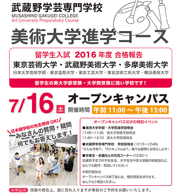 本校では毎年、オープンキャンパスを開催しています。本校の学校説明会をはじめ、美大進学相談コーナーなど企画を行っています。特に本校は、留学生美大進学に強い学校です。留学生の方で美大進学の相談をしたい方も大歓迎です。